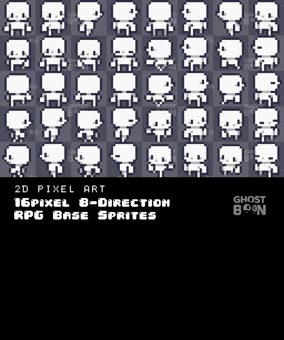 This Pack will give you the flexibility to create tonnes of characters from one simple top-down RPG base sprite. Measuring at 16px by 16px, this pack features:
